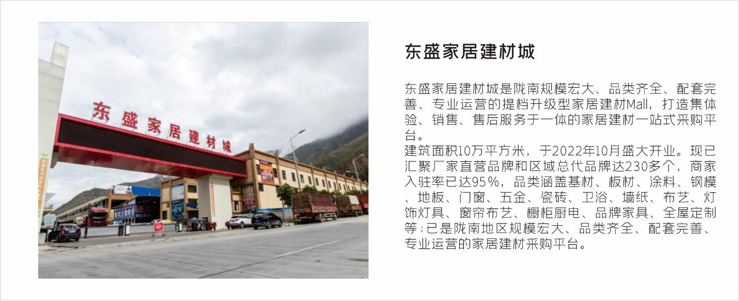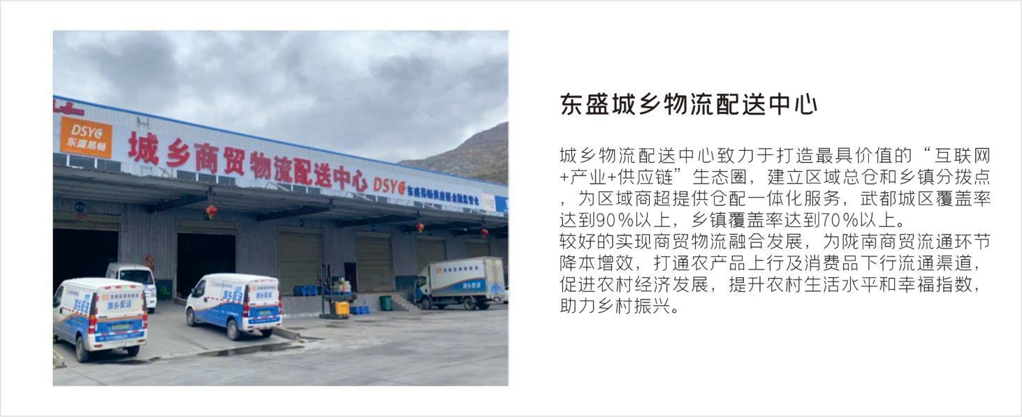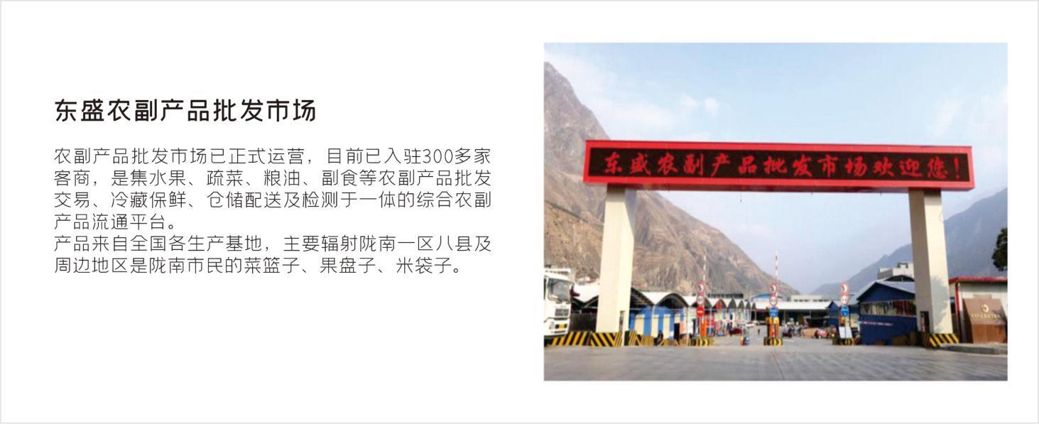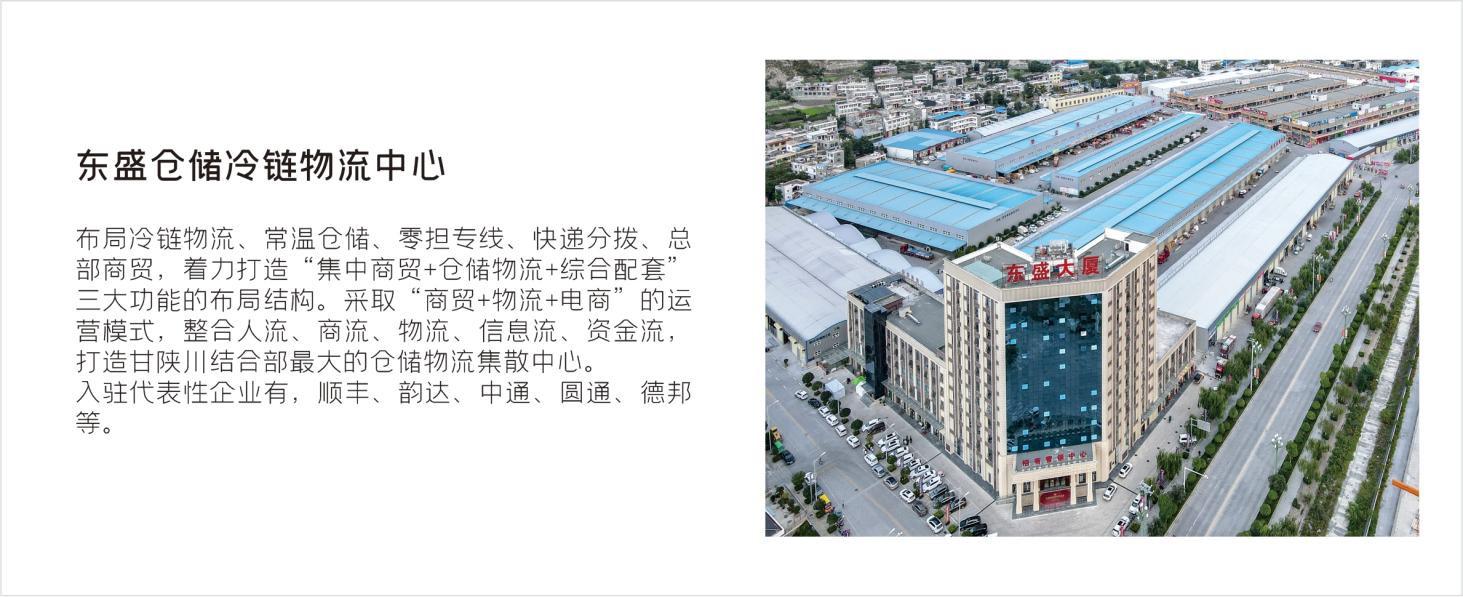 東盛物流運營的隴南東盛國際商貿物流港,定位集農副產品、家居建材、五金機電、小商品小百貨、倉儲物流、電子商務、綜合配套于一體的現代商貿物流集散中心,項目占地370畝,總建筑面積48.5萬平方米,總投資17.31億元,截止2022年物流園區總交易額突破50億元。先后被授予“國家農業農村部定點市場”、“國家級商貿流通標準化試點企業”“甘肅省八大重點市場之一”、“甘肅省農業產業化重點龍頭企業”。